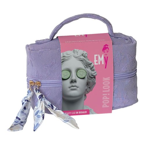 Pochette lilla contenente siero, contorno occhi e lip balm.
