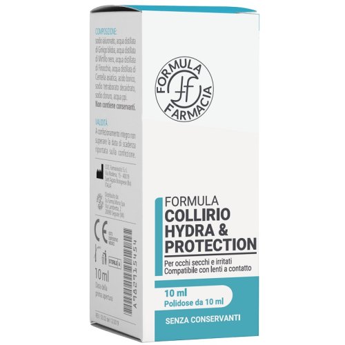 La formula contiene anche: acque distillate di Ginkgo biloba, Centella asiatica, mirtillo e finocchio per assicurare un’azione idratante, sodio cloruro e due sistemi tampone (acido borico e sodio tetraborato decaidrato) per garantire una soluzione fisiologica. FORMULA COLLIRIO HYDRA&PROTECTION può essere utilizzato da portatori di lenti a contatto. È compatibile con lenti a contatto.