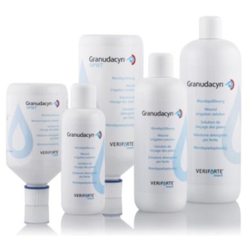 Soluzione super ossidata per l'irrigazione delle ferite. Granudacyn è una soluzione acquosa con pH 7.2 stabile, pronta per l'uso.