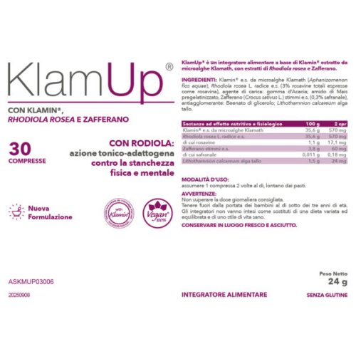 Klamin e.s. da microalghe klamath (Aphanizomenon flos aqua), Rhodiola rosea L. radice e.s. (3% rosavine totali espresse come rosavina); agente di carica: gomma d'acacia; amido di mais pregelatinizzato, zafferano (Crocus sativus L.) stimmi e.s. (0,3% safranale); antiagglomerante: beenato di flicerolo; Lithothamnion calcareum alga tallo.